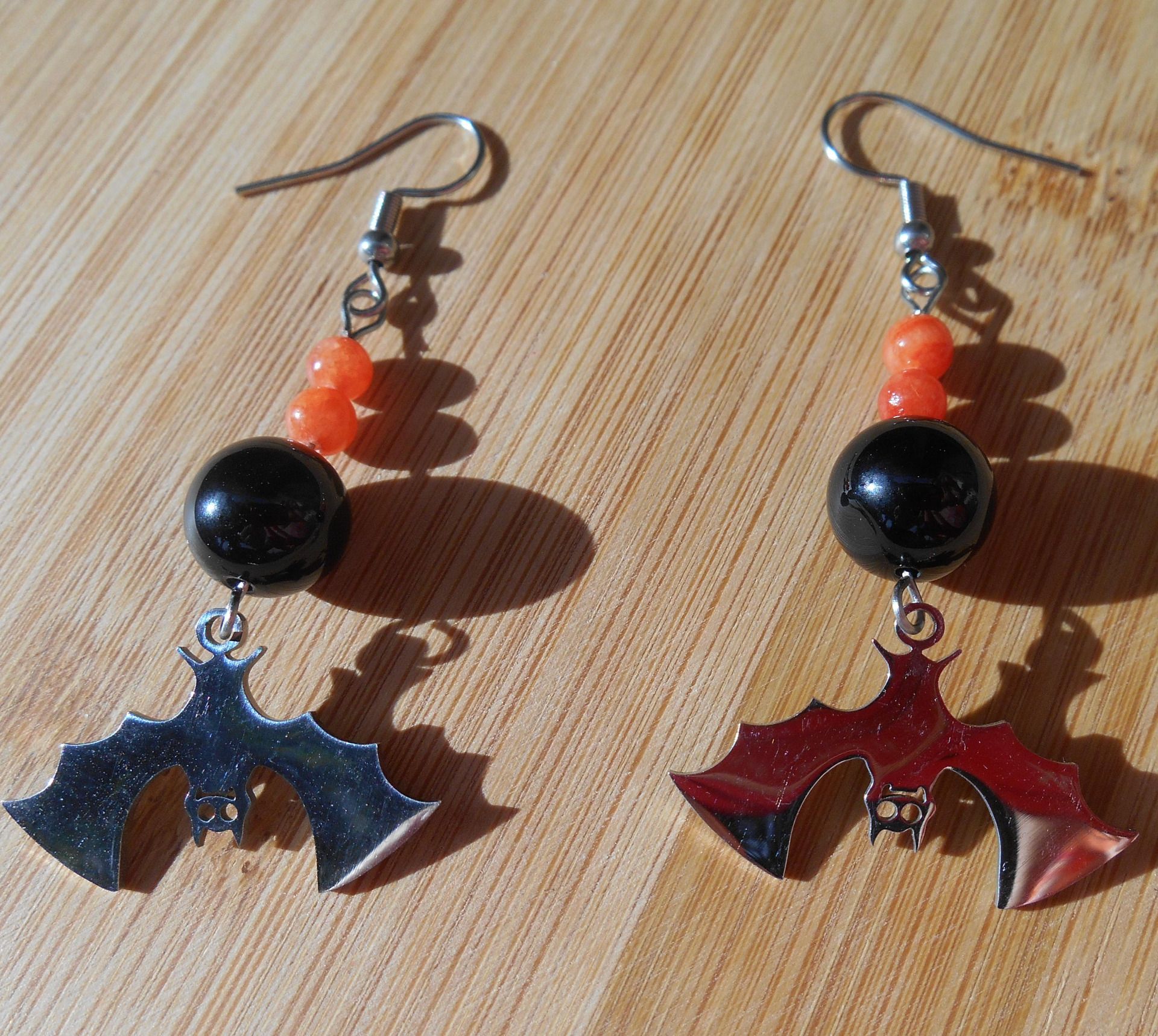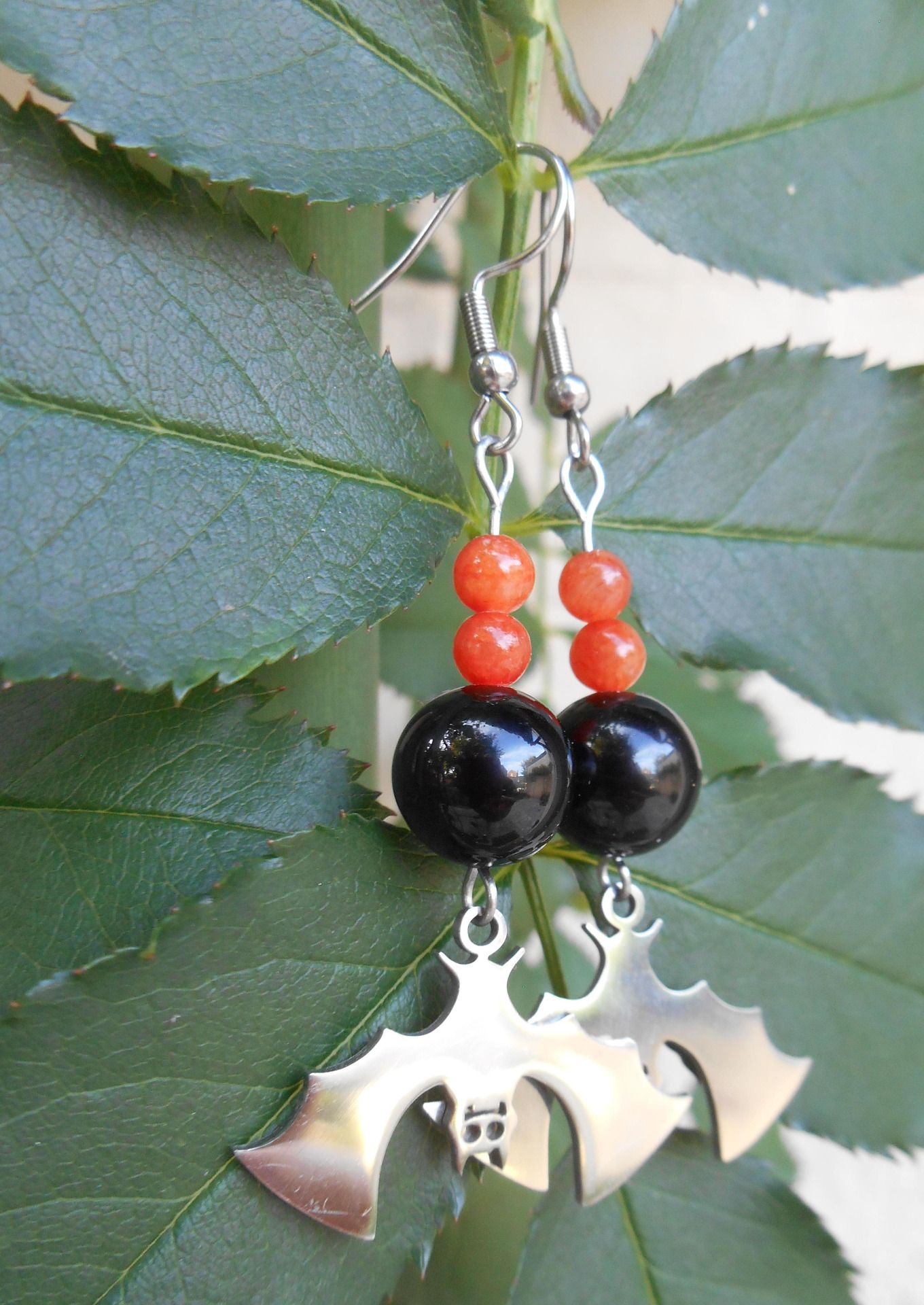 Boucles d’oreilles d’Halloween en acier inoxydable avec agate noire, jade orange et chauve-souris (elle aussi en acier inox.)