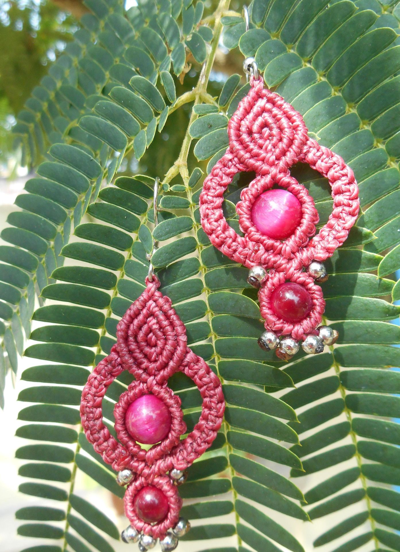 Boucles d’oreilles en macramé framboise avec œil de tigre fuschia et acier inox. (Réf. BO 4925064)