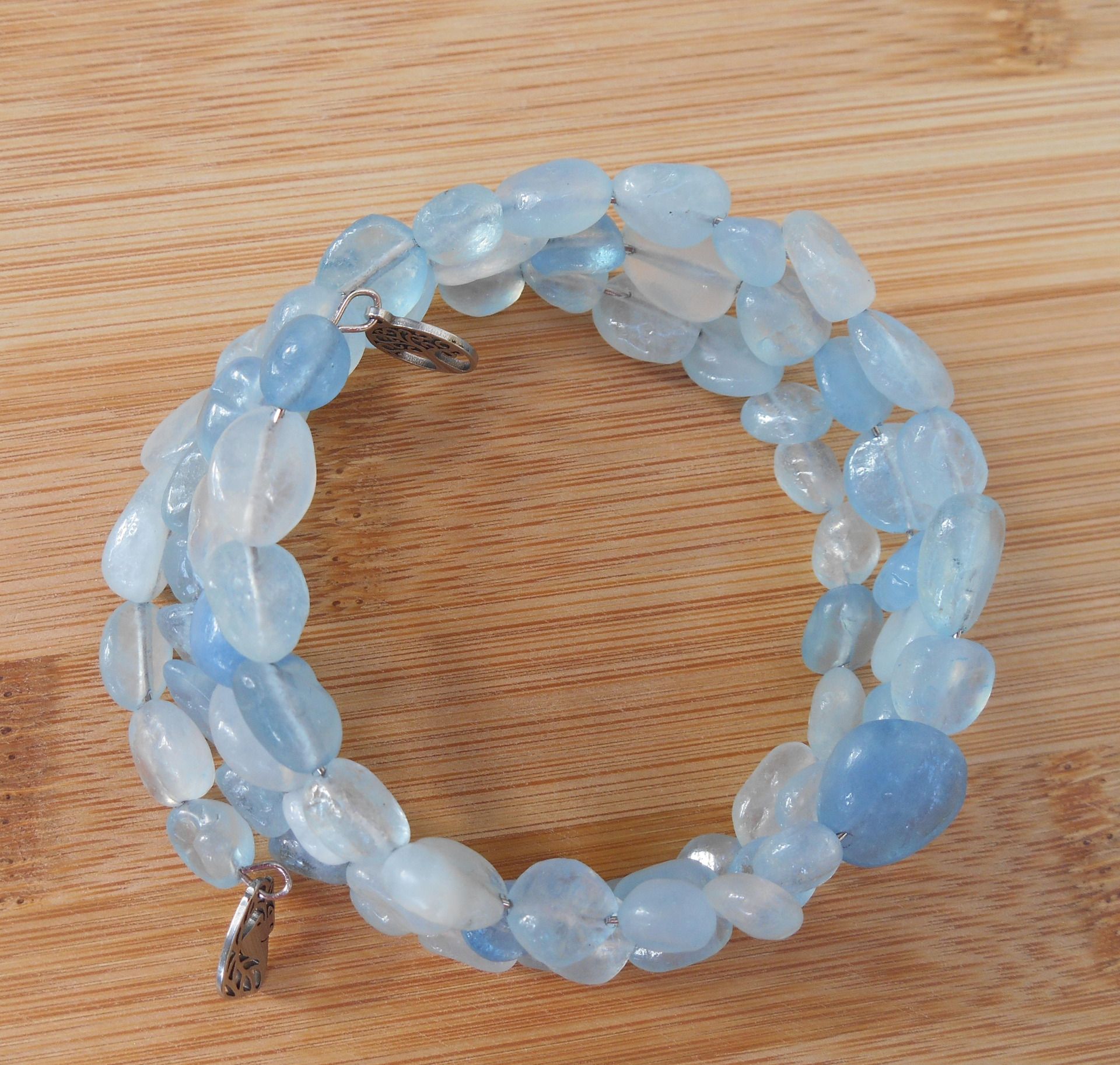 Bracelet multirangs avec aigue-marine irrégulière, aux différentes nuances de bleu et de vert agua. Les pampilles sont en acier inoxydable.