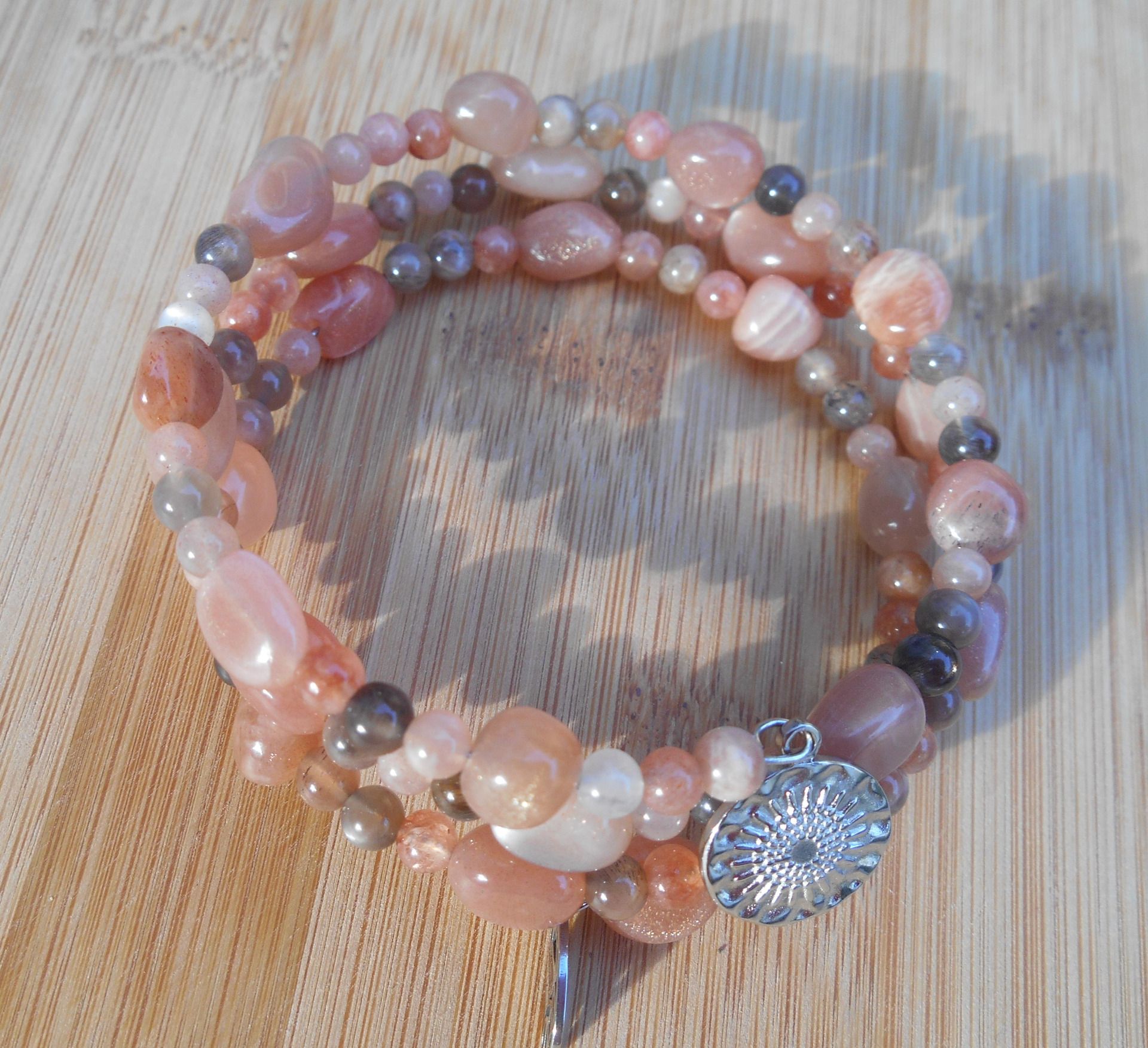Bracelet à rangs multiples en acier avec pierre de soleil et pampilles en acier inoxydable