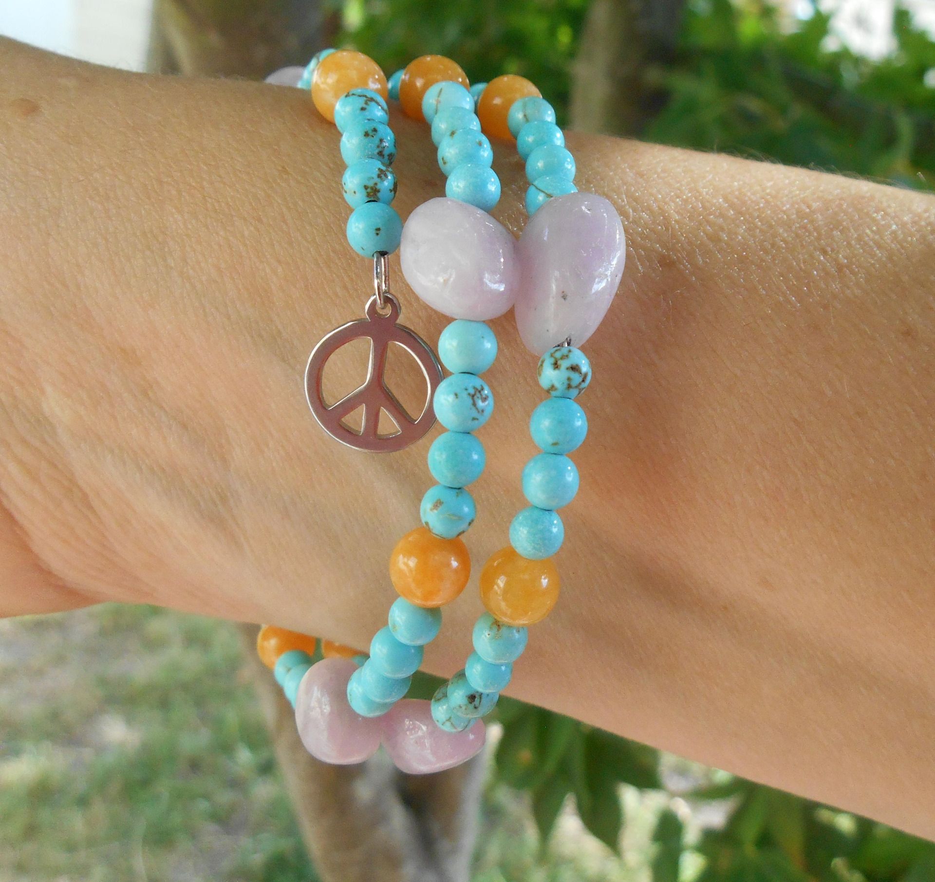 Bracelet acier multi-rangs avec kunzite, jade jaune, turquoise et pampilles en acier inoxydable