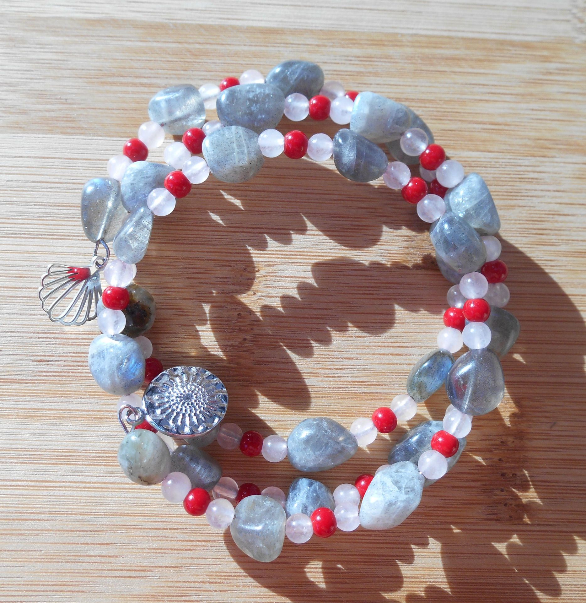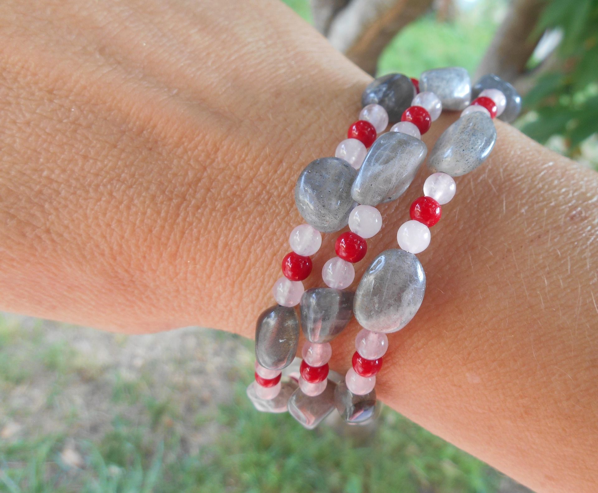 Bracelet en acier multi-rangs avec labradorite, quartz rose, corail rouge et pampilles en acier inoxydable