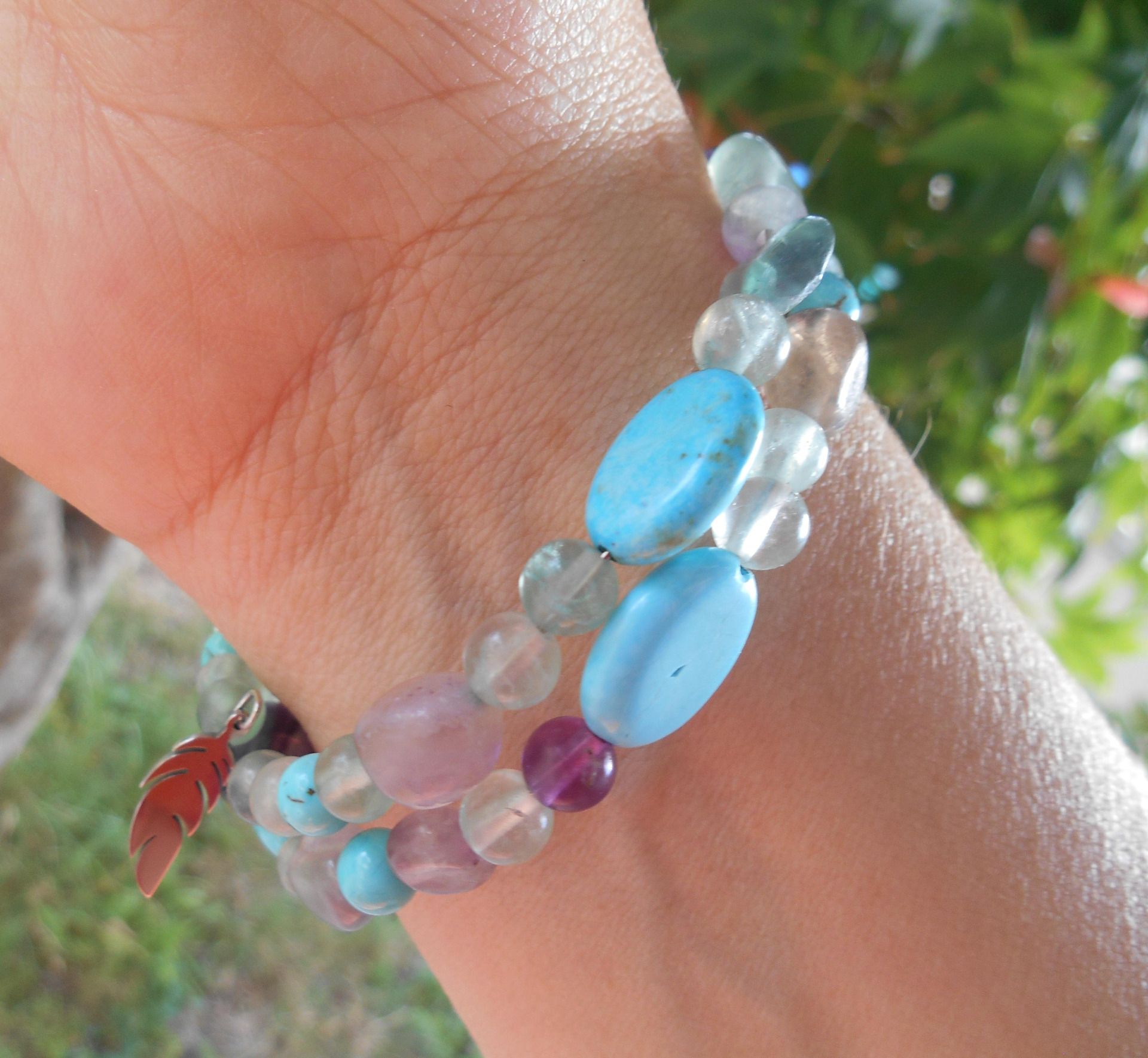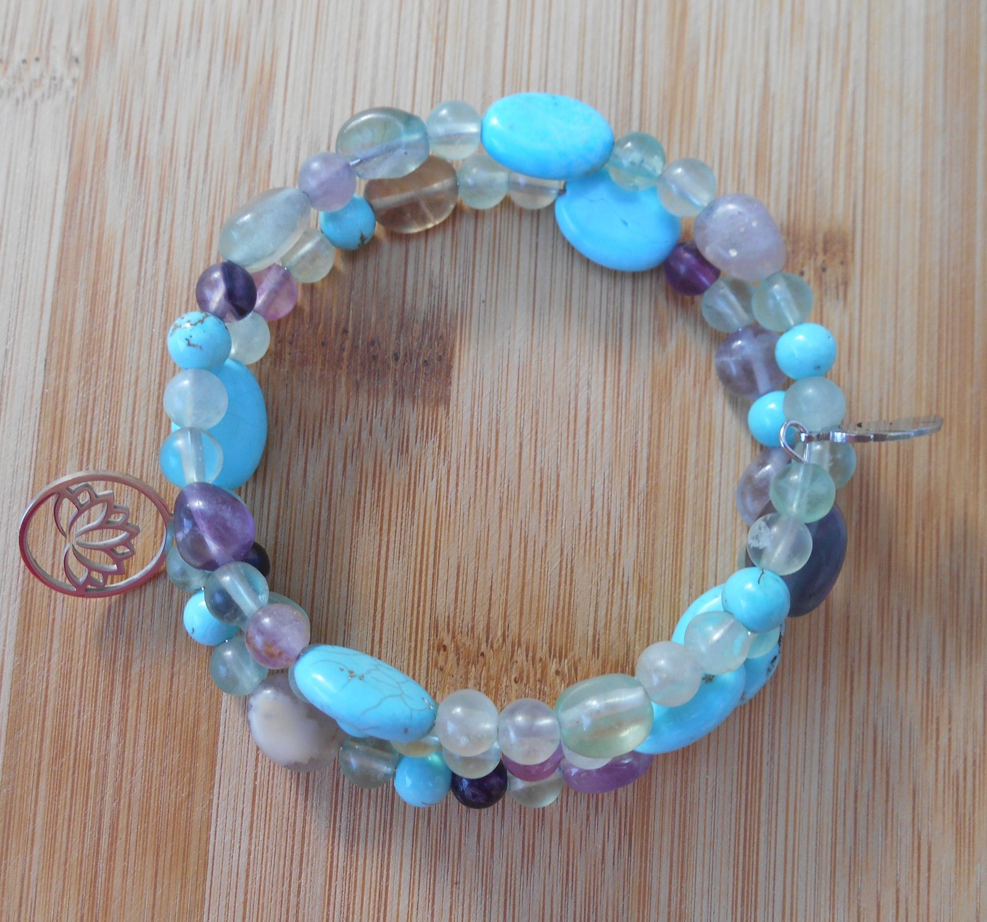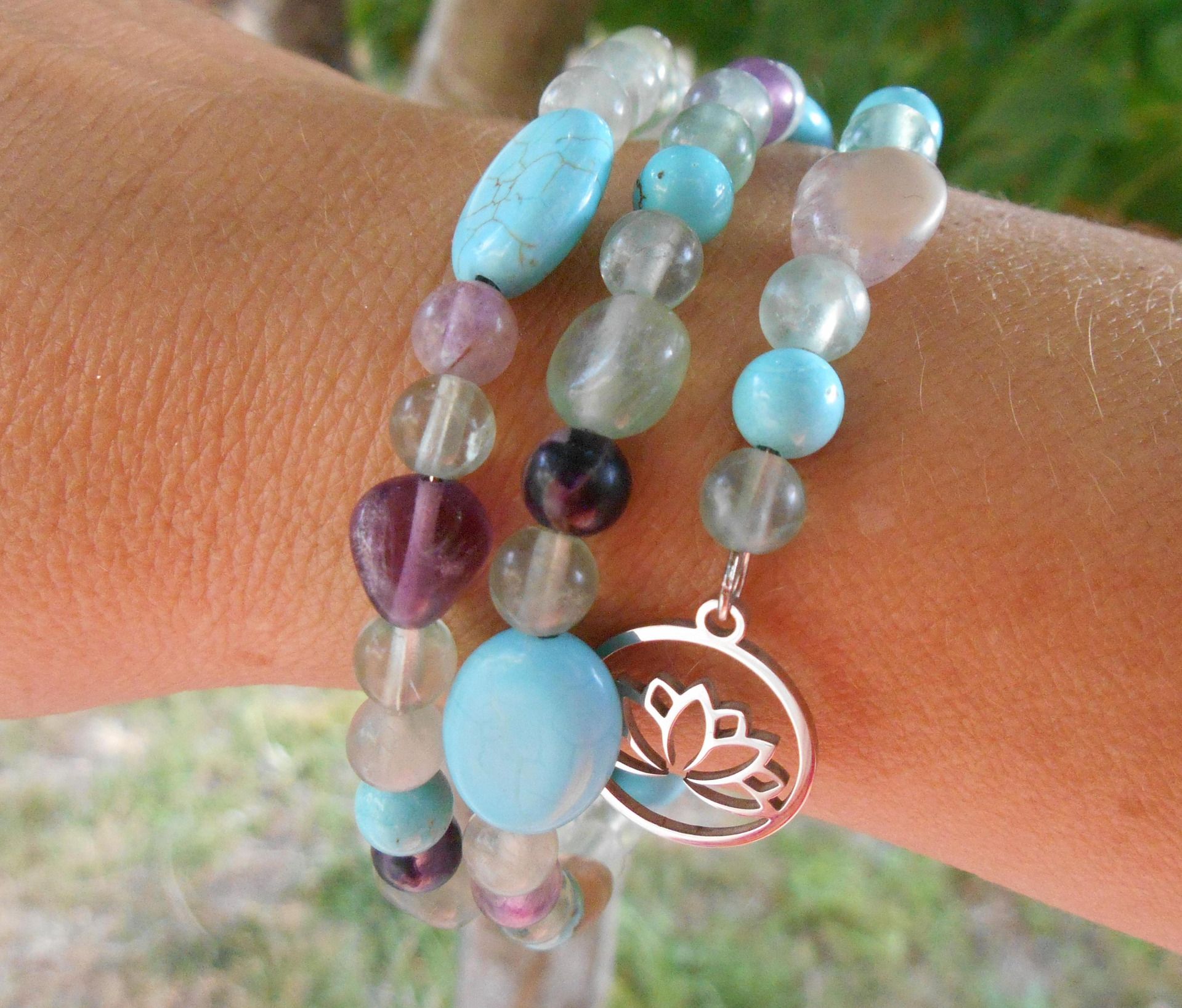 Bracelet acier multi-rangs avec quartz fluorite, turquoise et pampilles en acier inoxydable