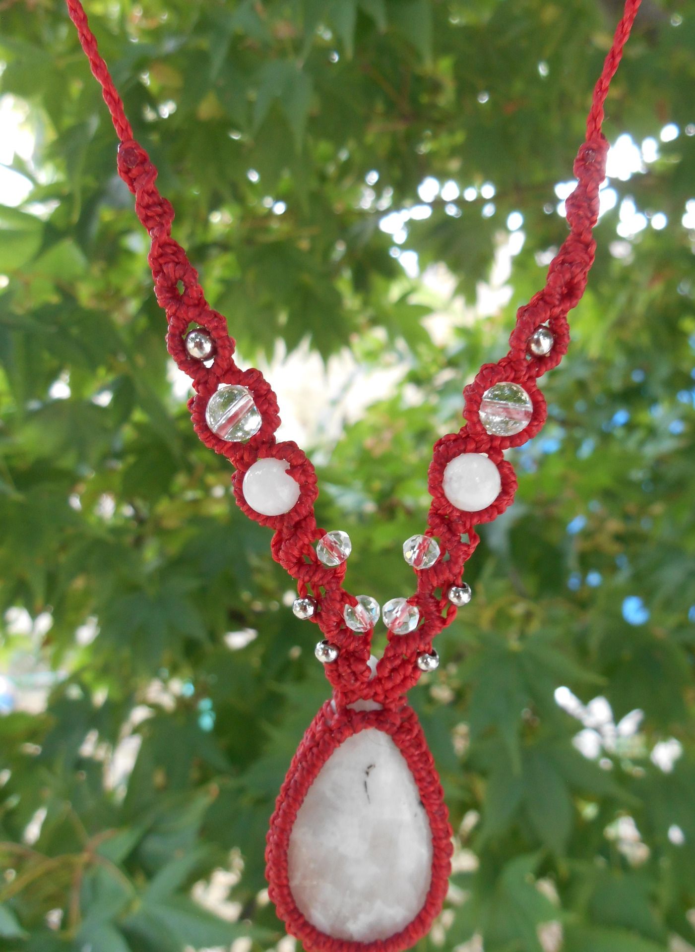 Collier rouge avec pierre de lune, quartz cristal de roche, perles facettées de verre et acier inoxydable