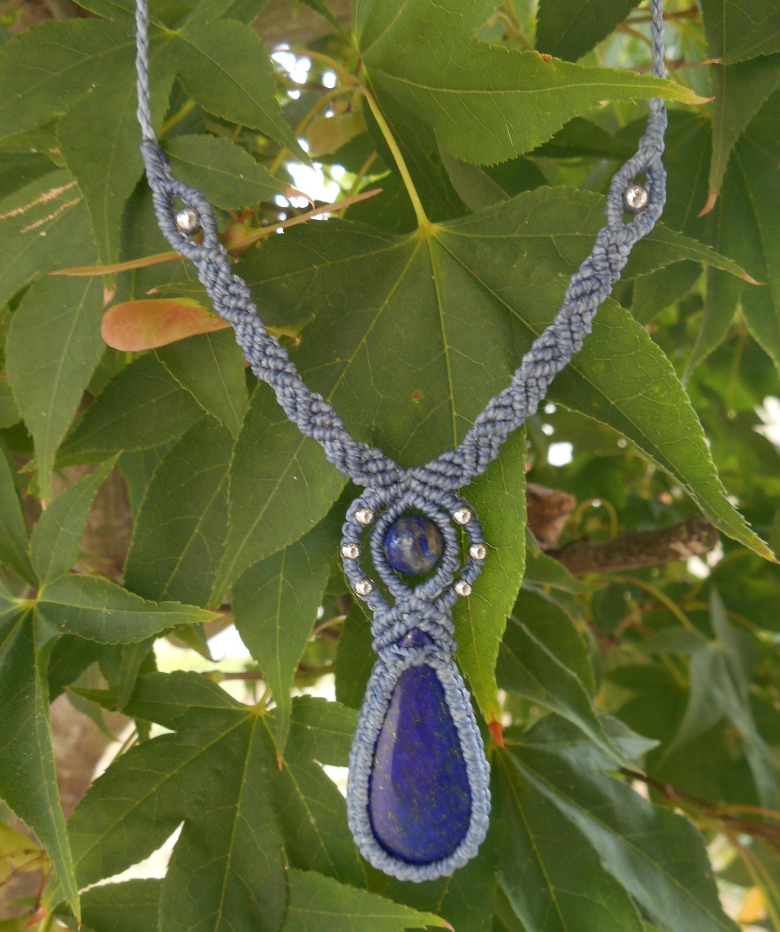 Collier macramé bleu jean avec lapis-lazuli et acier inoxydable